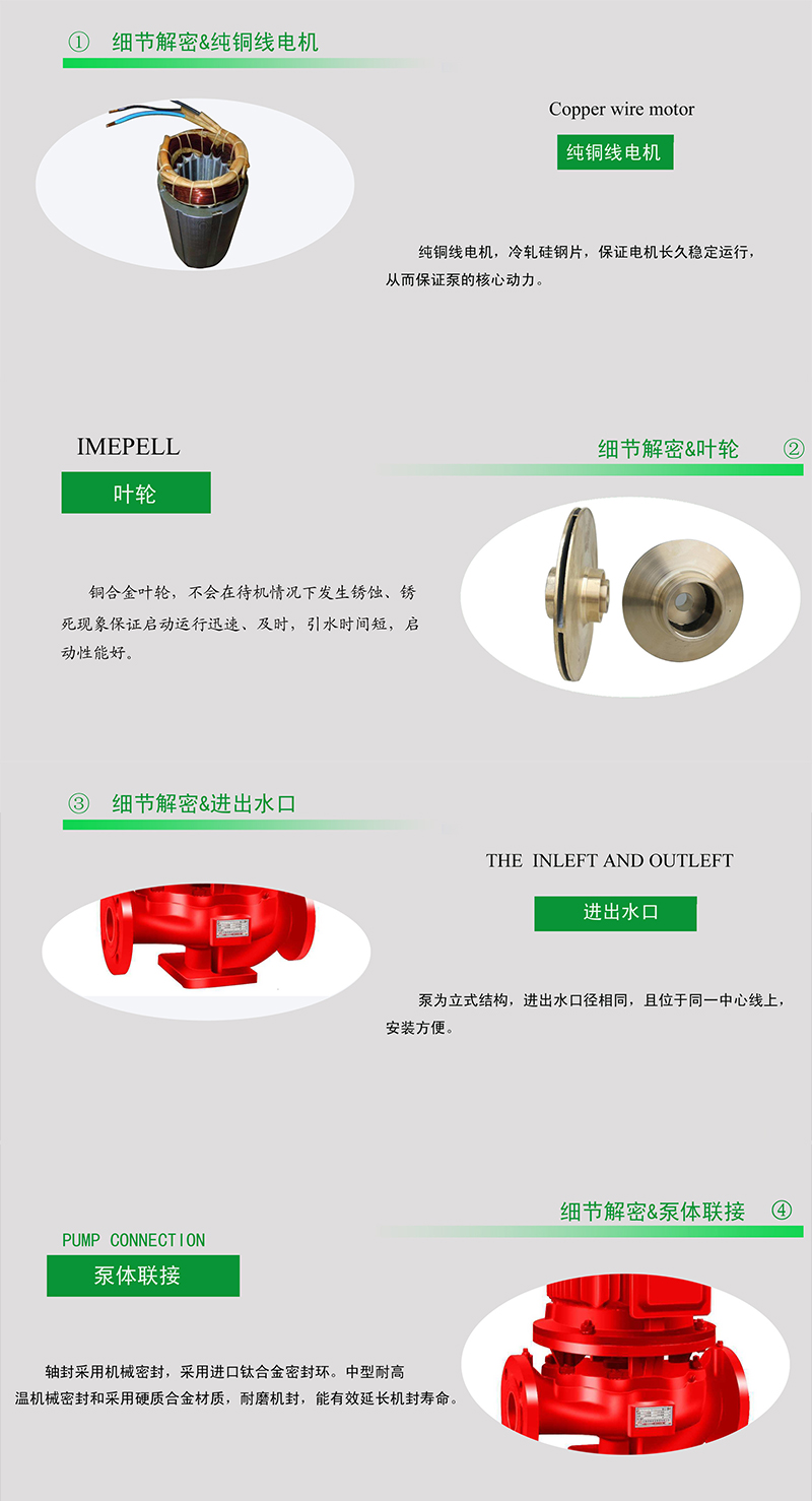 從結構原理來看,單級消防泵的核心特征是僅有一個葉輪。流體從吸入口進入泵體后,在葉輪的高速旋轉作用下獲得動能,通過蝸殼式流道轉換為壓力能,直接從出水口排出。這種結構使得泵體內部流道短而直接,水流阻力小,機械損耗較低。而多級消防泵則采用多個葉輪串聯的設計,水流依次通過各級葉輪,每經過一個葉輪就完成一次能量疊加,最終形成更高的出口壓力。多級泵的泵軸更長,需要設置中間支撐結構,整體布局更為緊湊但內部構造更復雜。